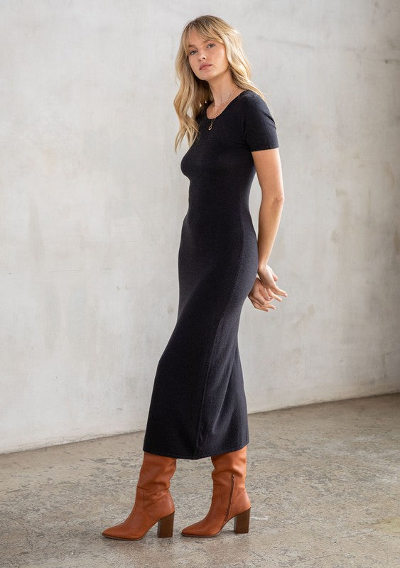 Cap short sleeve crew neck wrap back detail sweater dress.