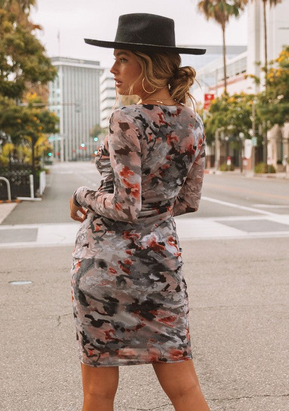 A trendy long sleeve mesh Bodycon knee length dress in an abstract print. Featuring stretchy slim fit