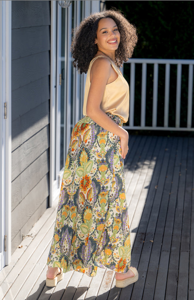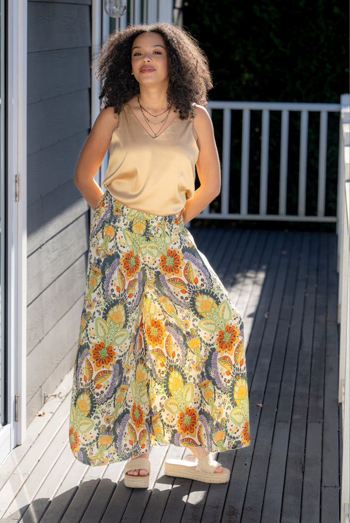 *ETA 5/14-5/30* The Pali wide leg pant has a ruched stretchy back and side pockets. Made in a silk/poly blend fabric. The vibrant summer colors make it a great add to your wardrobe and easy to pair with any style top. Great for travel or weekend getaway and adds a unique charm.