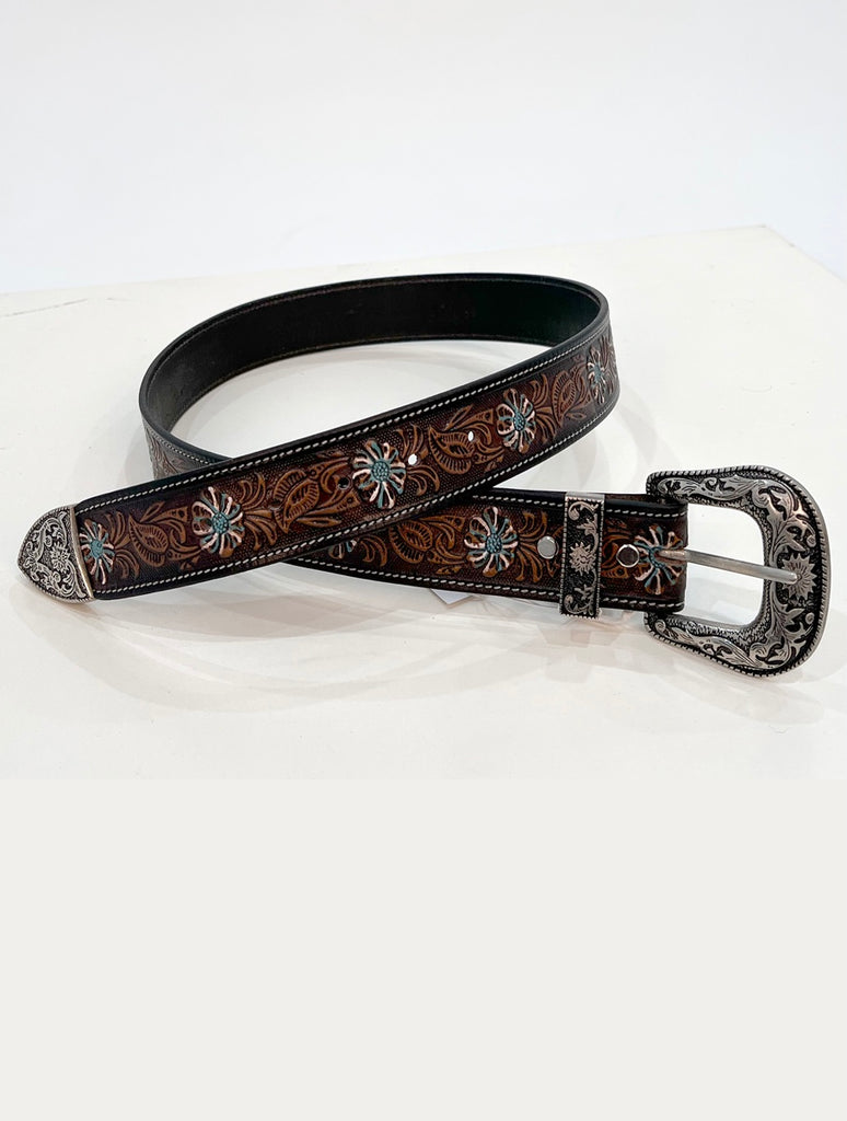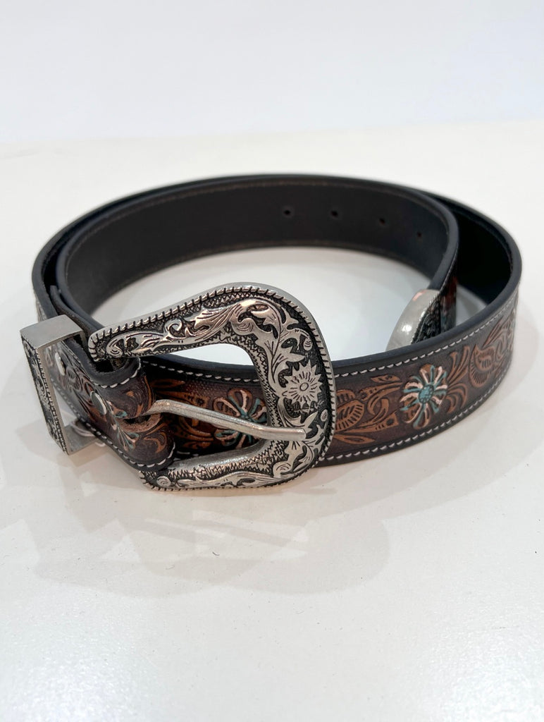 Tolled leather belts boho western style with either ivory design with antique gold buckle or Turquoise design with antique Silver buckle