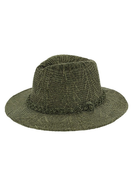 Chenille pattern & braided band winter fedora hat. One size with adjustable ties inside