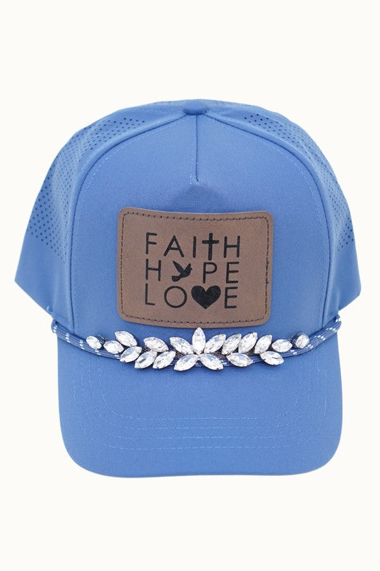 Bejeweled glitz trucker hat with leatherette detail. 100% Polyester for comfort, performance and style. Fused buckram backing, laser perforation for enhanced airflow, two tone braided rope and moisture wicking sweatband keeps you cool and dry. Adjustable SnapBack