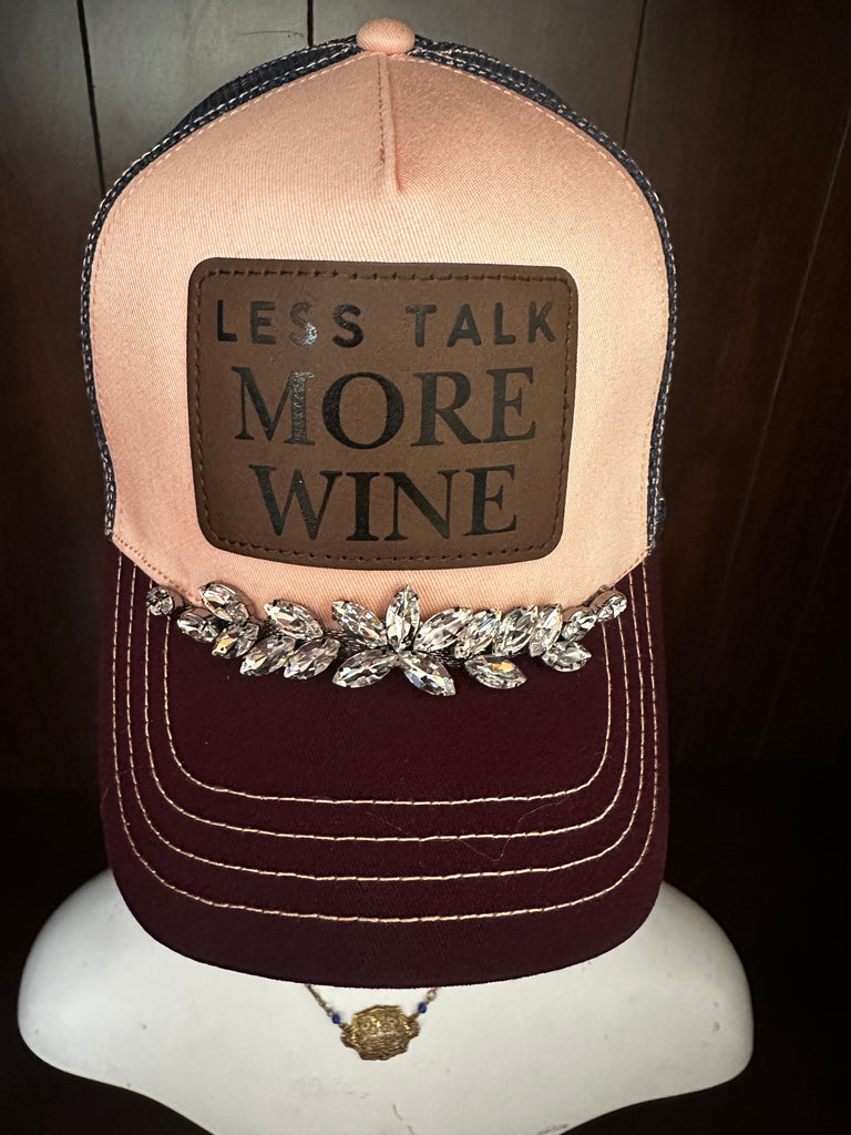 Less talk more wine color story trucker hat. Features a stunning rhinestone band curated for both trendy and everyday style. Adjustable SnapBack closure ensures secure, customizable fit.