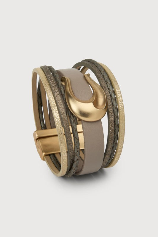 A lucky charm with a modern twist, our Horseshoe Charm Leather Bracelet is the perfect blend of casual and chic. This multi-strand bracelet features a variety of textured bands, from braided olive to smooth taupe and metallic gold, all centered around a bold, golden horseshoe charm. To style this piece, wear it as a solo statement accessory with a simple long-sleeved top or stack it with other delicate bracelets for a layered, bohemian look. Material: Leather, Matte Fine Gold Size: 8" in Magnetic Closure