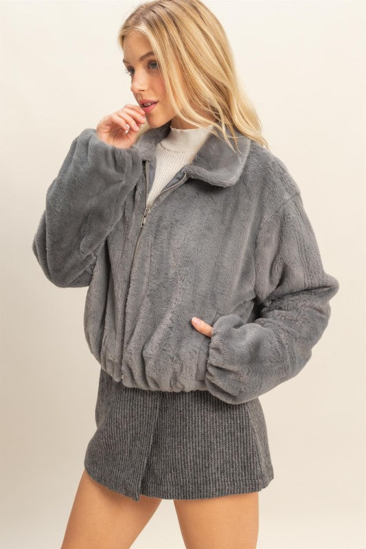 Crafted for both function and flair, features a unique plush collar that adds a modern twist on classic outerwear. Ideal for layering, this pairs effortlessly with long sleeve tees or light sweaters.