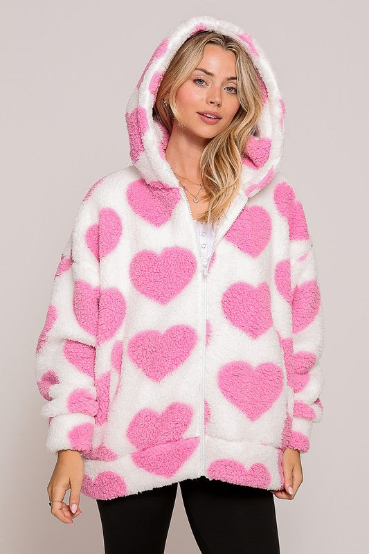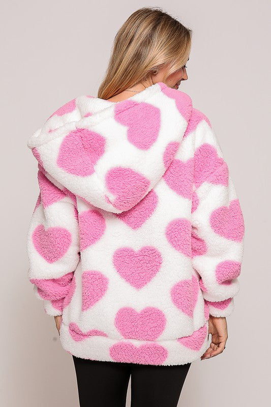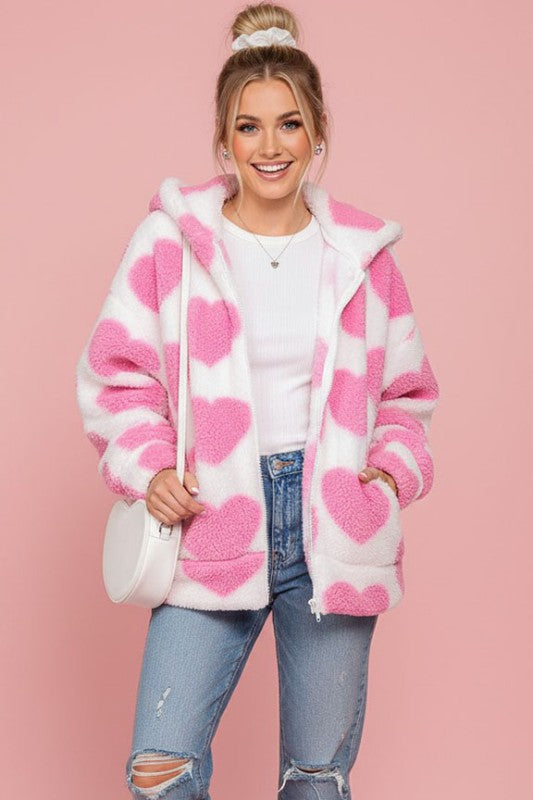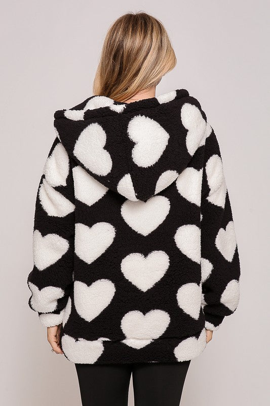 Stay cozy and stylish with our Heart Sherpa Hooded Jacket, the perfect addition to your outerwear collection. This unique jacket combines warmth, comfort, and a playful design, making it an instant favorite .Adorned with an eye-catching black heart pattern on a soft white background, this jacket adds a touch of fun and whimsy to your look.