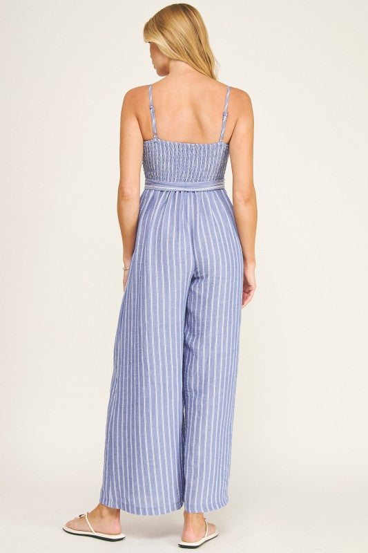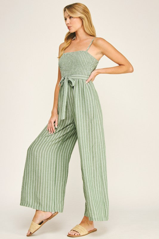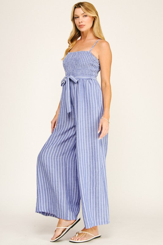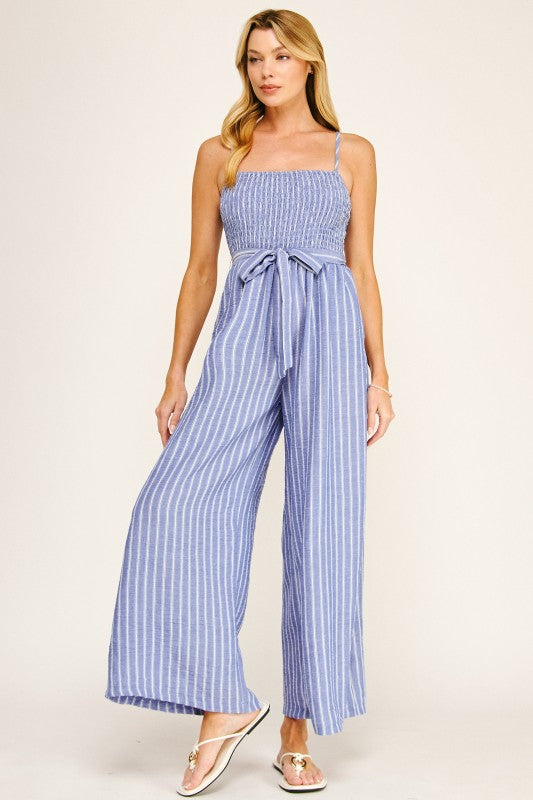 Effortless and elevated, the coastal stripe smocked wide leg jumpsuit is designed for warm days and easy styling. Featuring a full smocked bodice for flattering flexible fit, this piece offers delicate adjustable straps, pockets and a self tie waist belt to define the silhouette.